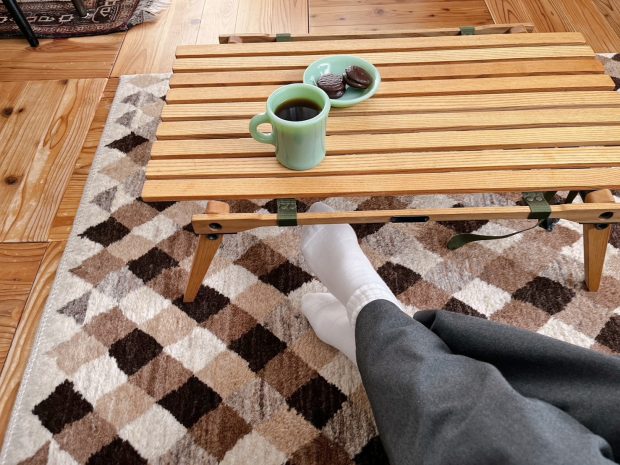『そうなると・・・そんな大きくなくても、薄手だし、椅子の脚が4つとも乗らなくてもこれまたいいんじゃない?』という思考になり、