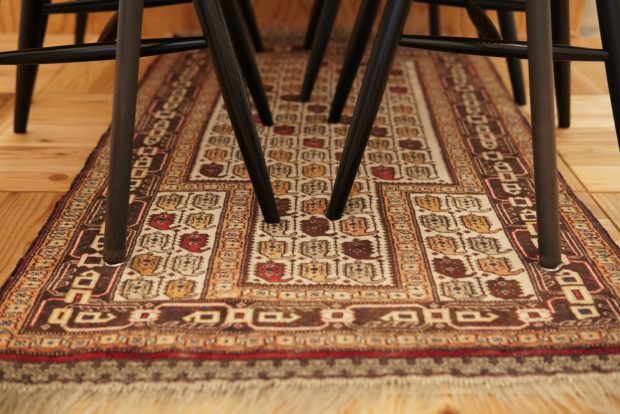 ちょうど、少し前にダイニングテーブルを購入した時期で、テーブルの天板のサイズとほぼ同じ大きさのトライバルラグ。