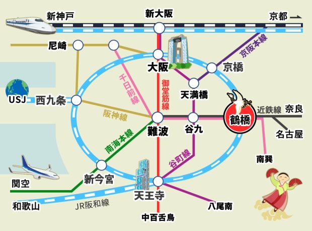 鶴橋駅には「JR大阪環状線」「近鉄大阪線・奈良線」「大阪メトロ千日前線」と、