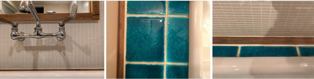 正面の立ち上がりはおろか、天板にもタイルを使うなんて、どうやって目地のお手入れするのよ!