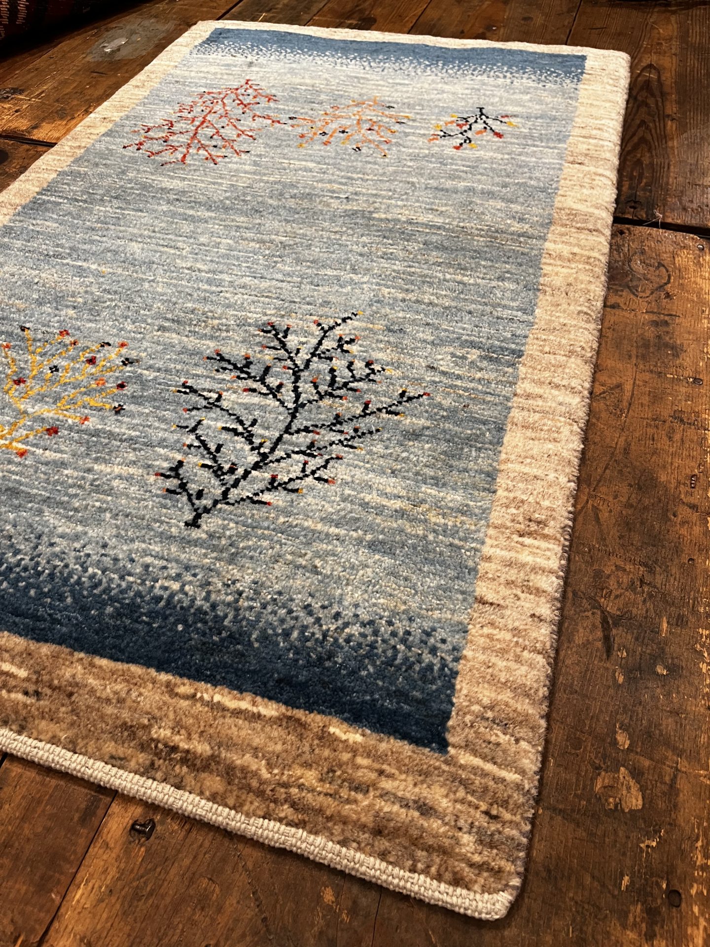 優しい藍色の中にアートギャッベならではの艶がキラッときらめく所や