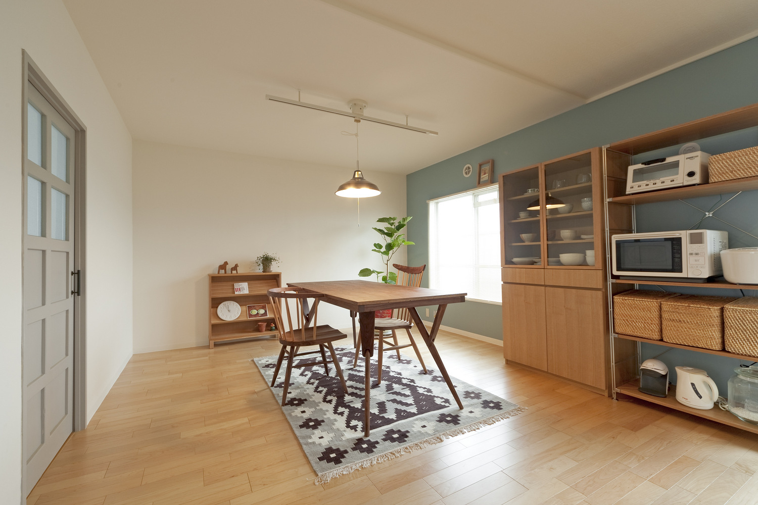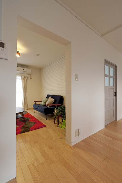 WORKS 団地リノベ出発点!|25 OUTLINE 所在地 大阪府 築年数 24年 面積 75.95m² 工事費 500万円 工期 30日 ※工事費・価格は施工当時の価格となります DESCRIPTION 間取りはそのまま、建具を塗装や加工したり、壁紙に変化をつけたりと、ちょっとしたアイデアとディテールへのこだわりでパリのアパルトマン風住まいが完成しました。水廻りはすべて入れ変えながらコストとのバランスをご提案いたしました。 キッチン、宙に浮く|26 大きな赤いお片づけ箱|24