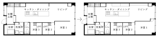 13年前、シンプルハウスにリノベを依頼されたご家族のリクエストは、主寝室1つ、子供部屋2つ、計3つの独立した部屋とLDKでした。個室は1列に配置し、子供部屋2室にはベッドとなるロフトを設け、廊下を排除。個室とLDKをダイレクトにつなげ、空間を最大限に有効化しました。ズドンと真ん中に位置するキッチンからはご家族の様子が見渡せます。