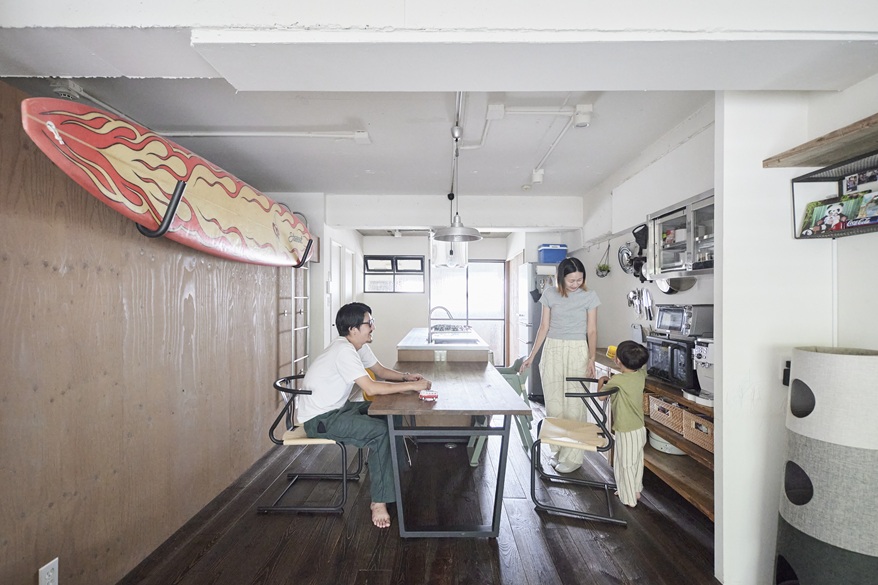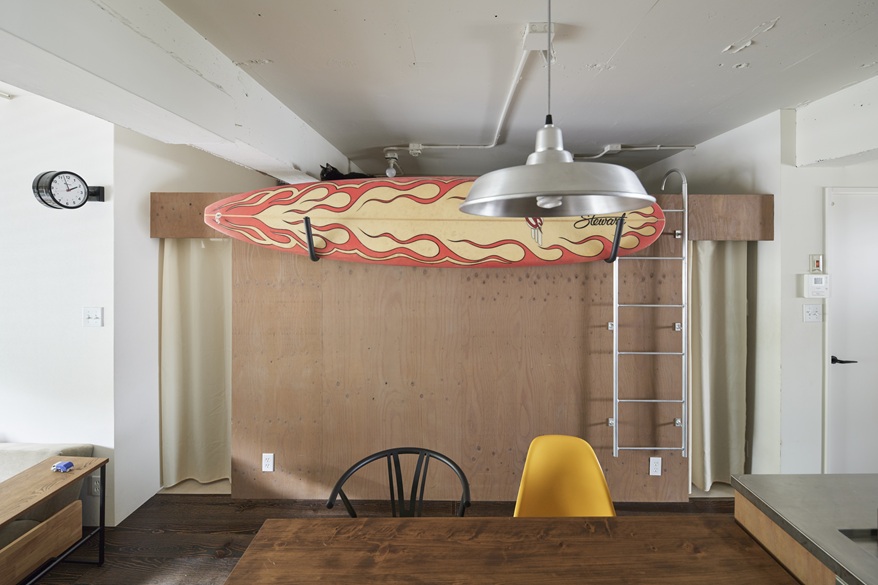 売り出しになったばかりのこの物件、いち早く発見し、内覧を最初に申し込まれたのがT様でした。T様はリノベを想定して、中古物件を探してはいませんでしたが、ボルドーパインの一枚板のフローリング、剥き出しのコンクリート、黒いフレームの室内窓と建具、LDKのどこにいてもお子さんの様子を見渡せる間取り、リノベならではの要素に、すっかり夢中に。長年愛用されているサーフボードをディスプレイするのに、ぴったりの空間でした。階下が駐車場のため、お子さんが自由に動き回れる点もお気に入りです。