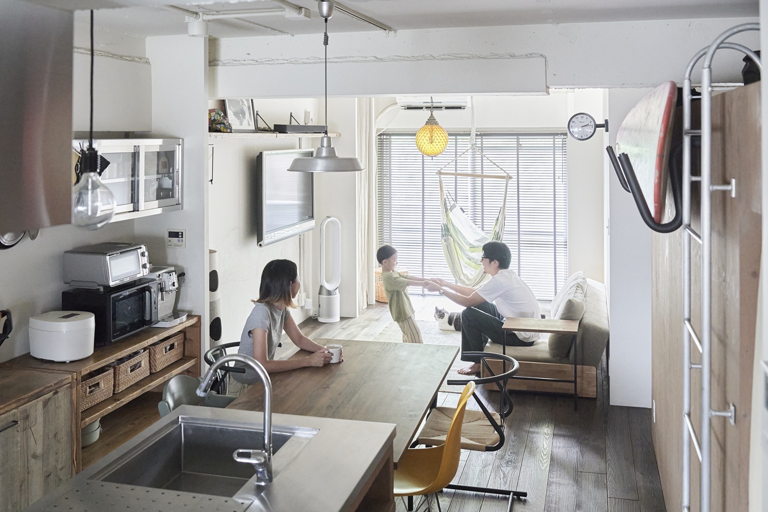 「物を丁寧に選んで買うようになりましたし、暮らしに愛着がわきました。家で淹れたコーヒーをよく飲むようになりました」と、旦那さま。家族いっしょにくつろいだり、にぎやかにしたりができる空間です。家族から別の家族へ。時を経て、家族への想いはリノベのバトンパスで受け継がれているのでした。