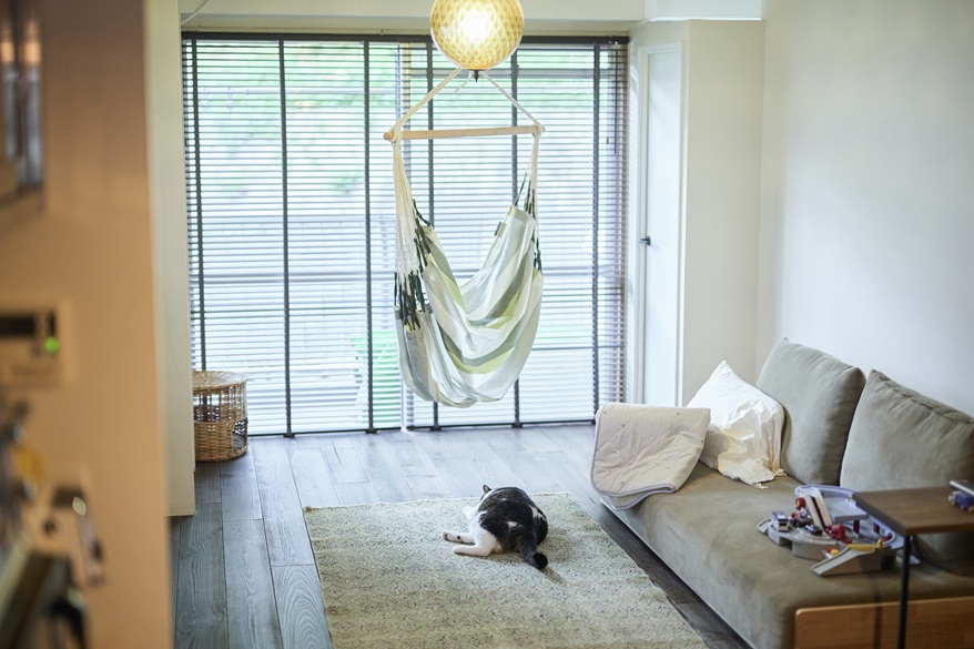 ブラインドは、以前のリノベーション時に設置されたものをそのまま使用。ハンモックは新たに設置しました。フローリングは木目を足裏に感じる浮造り仕上げ。「床が真冬でも冷たくなくて、足ざわりが良くて気に入ってます」。