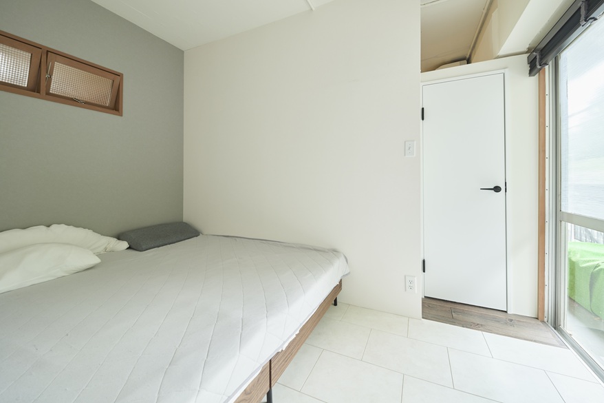ご家族の寝室。隣の部屋に光と風が届くように設置されていた室内窓もそのまま再利用。建具と壁を設けたのみで、他は何も追加なし。