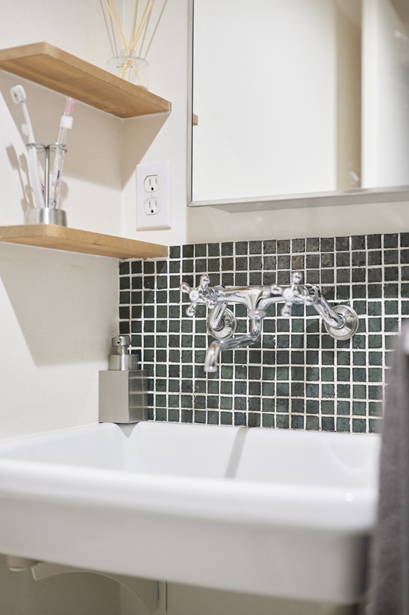 壁面タイル、実験シンク、壁付水栓、リノベならではの洗面所もそのまま使用しています。