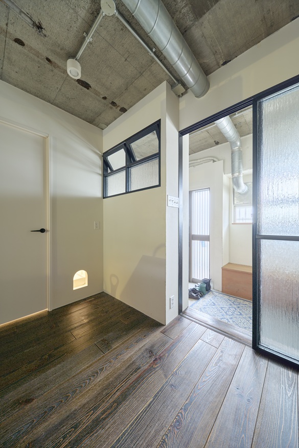 玄関側のアイアンフレームの建具と室内窓。これもそのまま使用。玄関側からも室内に光と風を届けます。洗面所の壁に新たに設けたのは、猫ちゃん専用の開口部。扉が閉まっていても、猫ちゃん用のトイレと行き来できるようになっています。