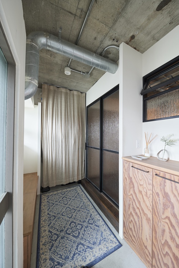 広々としたモルタルの土間にはラグを。猫ちゃんが廊下側の窓の方に飛び乗るので、敷いているのだそう。玄関は新に手を入れた箇所は無し。ベンチの下、カーテンの中は収納になっています。