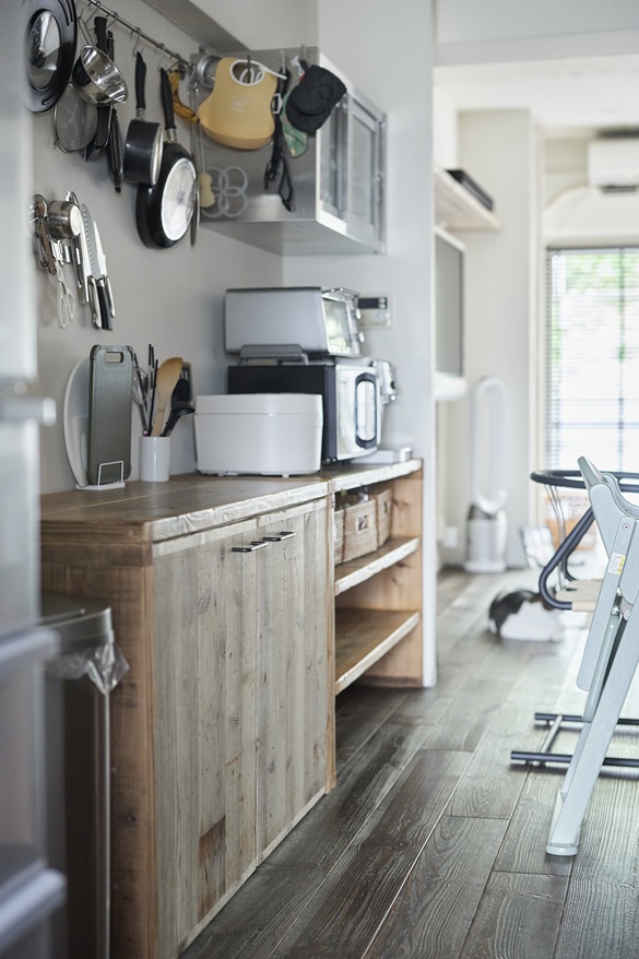 キッチンの背面には新たに収納を造作。天板、棚板などは杉の足場板、収納扉はエイジング加工を施した杉材を使用しました。「ふたりで物を丁寧に選ぶようになりました。空間に合うものを長く愛着を持って使っていきたいと思います」。と旦那さま。物にも、暮らしにも愛着がわいてくる住まいなのですね。