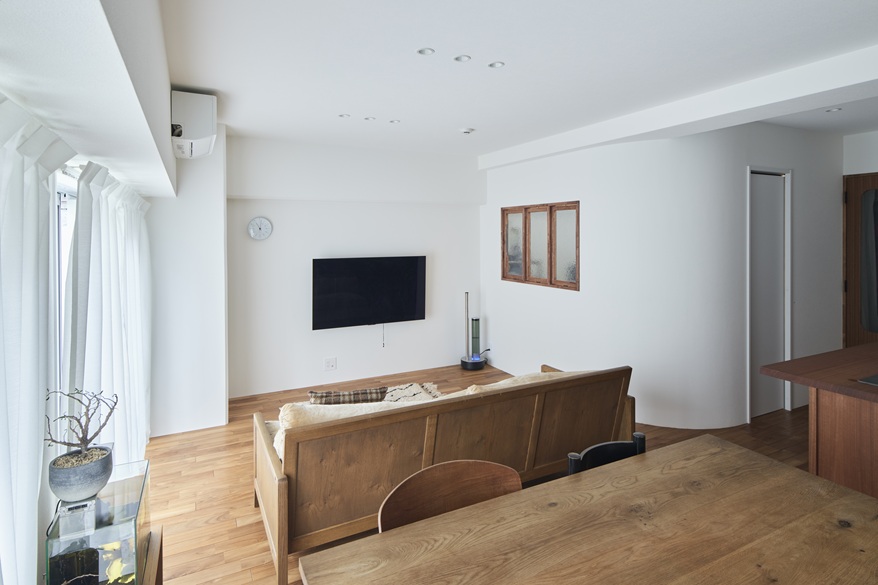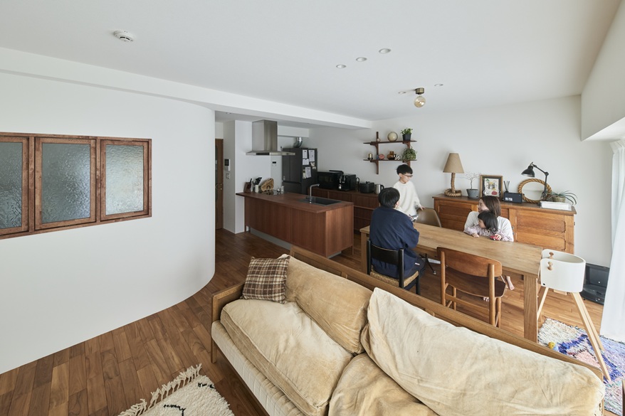 子供部屋の角がアールになることで、キッチンの前に広がりが生まれ、LDKの一体感が増すのがよく分かりますね。奥さまは週に2回、リビングでリモートワーク。お仕事中も、公園のあるベランダ側から差し込む陽に幸せを感じるそう。旦那さまが座られているのは、フランスの建築家でもあり、インテリアデザイナーでもあったシャルロット・ぺリアンのチェア。