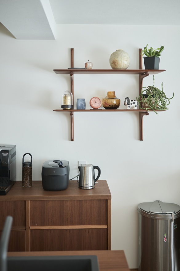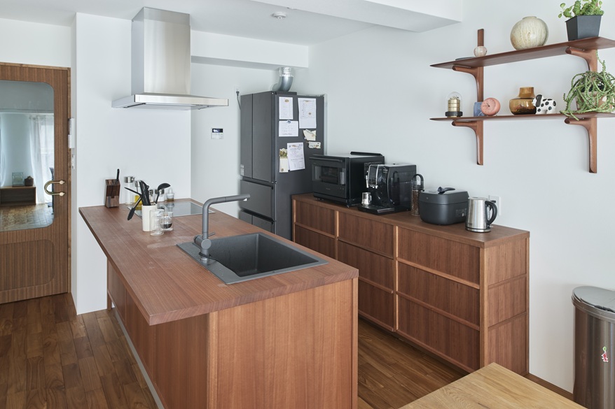 キッチンの側板は木材、天板はステンレス、といった組み合わせが多い中で、SYNC FURNITUREさん制作のキッチンは天板も木材。耐久性・防汚性を向上させながら、気の質感を保つガラス塗料を表面に塗装しています。「水濡れによるシミが心配だったけれど、大丈夫ですね」。使用後は水を拭き取られているそうです。キッチンの背面は別の会社さんでオーダーされた、ニヤトー材の収納棚。デザインはさることながら、素材の統一感も美しいですね。