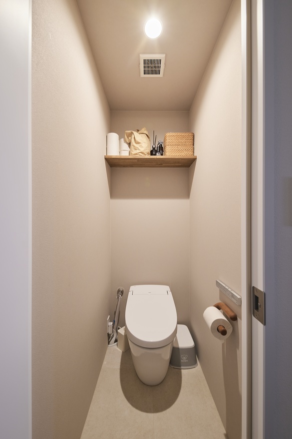 シンプルな仕上げのトイレに存在感が際立つのがペーパーホルダー。ご友人である木工作家さんの作品だそう。無機質になりがちな空間に、手仕事のあたたかさがアクセントに。
