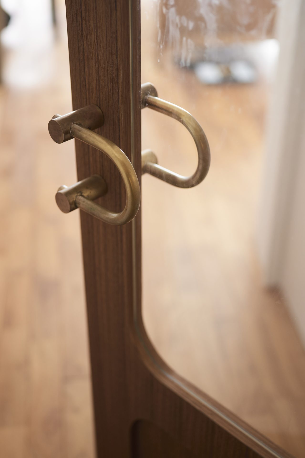 LDKにつながる建具はオリジナル。床と同じチーク材を用いました。LDKからの光が玄関側にも差し込むように、ガラス面は大きく。空間に合わせて、コーディネーターが真鍮素材の個性あふれるドアハンドルを選定しました。