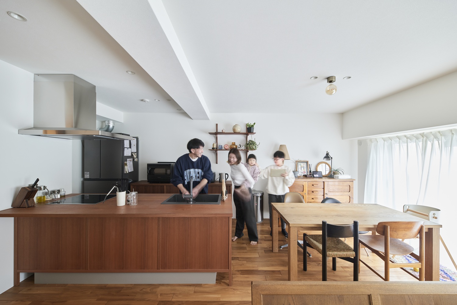 「家にずっと居たいです。以前は外に出かけたくなっていたけれど、今は家が快適で心地よいですね」と奥さま。「料理をするときに家族みんなの姿と、TVが目に入るのがいいですよね。家で食事をする機会も増えました」と旦那さま。日本とヨーロッパのクラフトマンシップが生み出した空間に、今日も家族は集います。