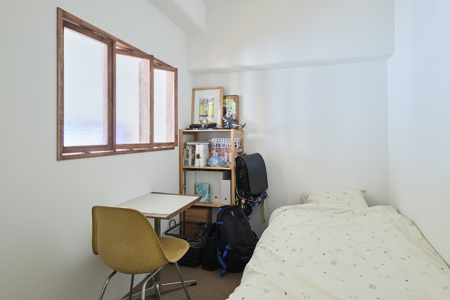 お兄ちゃんは公園でお友達と遊んで、お友達を家に連れてくる機会が増えたそう。自分の部屋って紹介できるのも嬉しそうなんですって。お兄ちゃんが巣立つ頃、妹さんがこの部屋を使う計画なので子供部屋は1つです。回転窓がエアコンの風を通します。