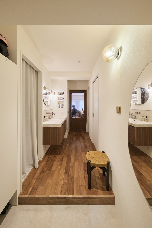 洗面所は「上質で洗練された空間」に基づいて、ゆったりと幅を取ることができるよう廊下へ配置。帰宅時は手を洗ってから、カーテンが間仕切りになっている隣のクローゼットに入り、アウターをかけます。LDKや子供部屋に入る前の動作がスムーズですね。