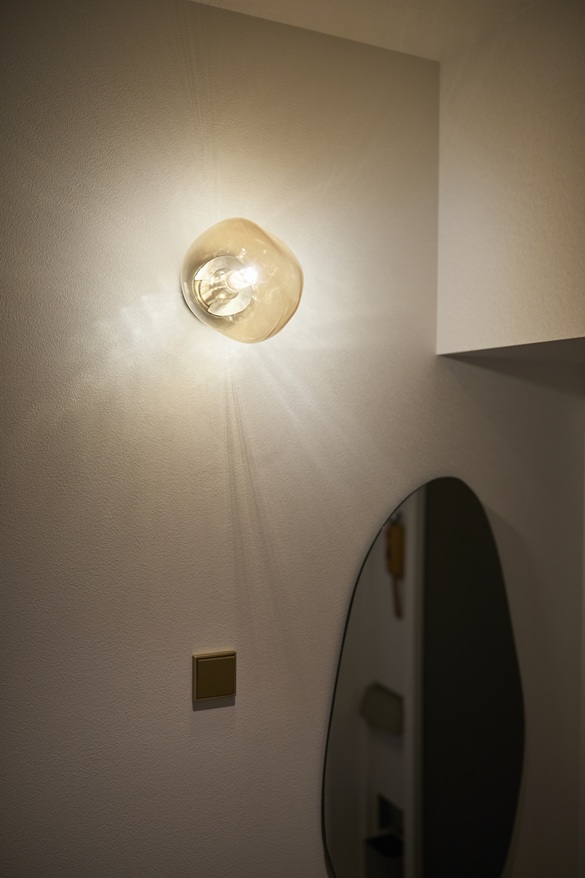 玄関の真鍮スイッチはドイツ製、ゆらぎのある形のガラスがおもしろいブラケットライトは中国製です。世界中からクラフトマンシップが集まっていますね。